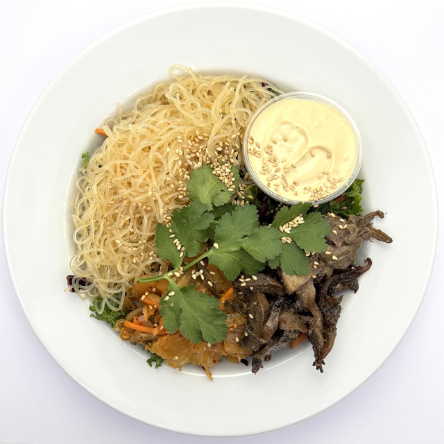Våra kockar lagar mat i butiken på butikens råvaror. I vår jakt på fler lättare rätter till sommaren samt att komplettera våra befintliga ”husmans” med asiatiska smaker – föddes idéen om denna rätt. Vi smakar upp glasnudlarna med sweetchilisås, blandar skuren grönkål med mer hyvlad kål och låter det marinera i spadet av kimchin. Sedan toppar vi rätten med svamp (portabello, ostronskivling & skogschampinjon) som har rostat i ugnen med shiro miso, kimchi & picklad lök. Samt skickar med en majonäs á la Asien (dvs. smakat upp med soja, vitlök & ingefära). Kort och gott alla goda smaker från Asien finns i denna lätta och vegetariska rätt.