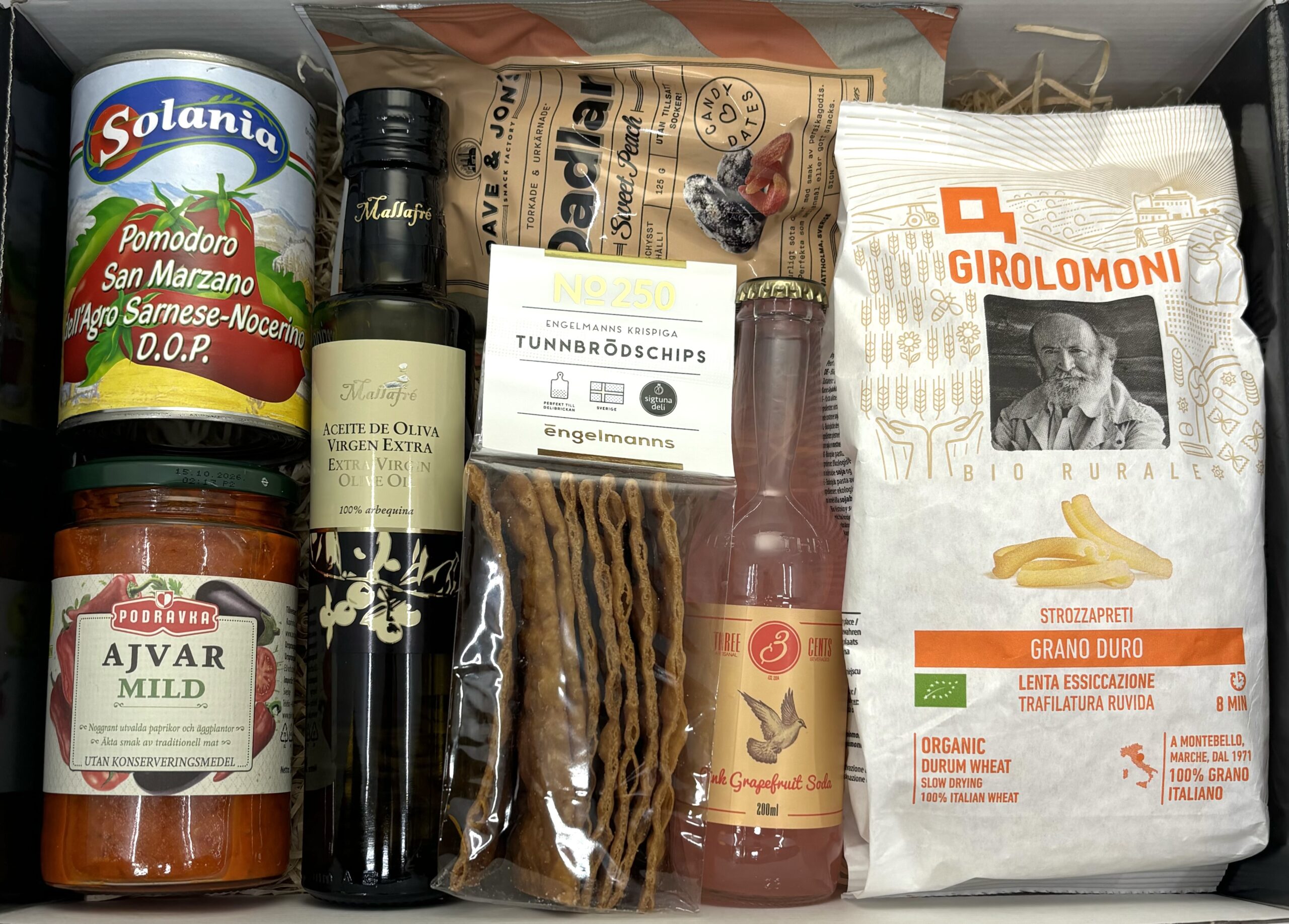 Pasta Girolomoni, Olivolja Mallafre, San marzanotomater D.O.P., Ajvar, Tunnbrödschips Sigtuna deli, Dadlar från Dave & Johns & Pink soda.